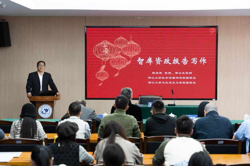 为切实增强教师资政服务能力,提升学科社会服务水平。学院在“思政理论课教学改革研讨会暨教师培训会系列讲座”中积极谋划并安排“资政报告撰写辅导”专题培训。2025年11月13日下午,学院特邀浙江大学马克思主义学院副院长、博士生导师陈宝胜教授莅临我院作“资助报告撰写”专题讲座。马克思主义学院院长王海稳教授负责主持。学院副院长黄岩教授,学院党委副书记、纪委书记夏朝霞副教授以及80余名师生参加本次活动。