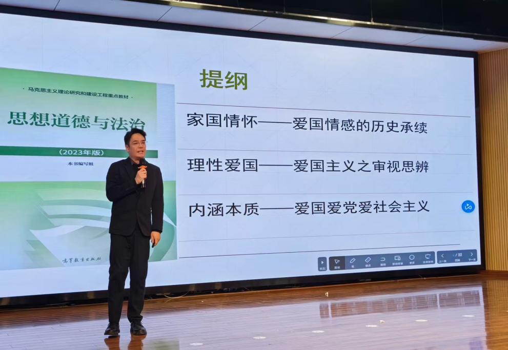 本次活动以“爱国主义教育”为核心主题,通过小学、初中和大学同上一堂课的教学实践,探索思政教育层层递进、循序渐进、螺旋上升的育人规律。我院思想道德与法治教研室主任刘宇老师在会上分享了《做新时代的忠诚爱国者》的说课内容,其中阐述了家国情怀和爱国情感的承续关系,爱国主义的核心内涵和基本原则,以及介绍了课堂小组研学和实践活动等环节。此外,西兴中学刘小兰老师讲授了初中阶段思政课《以中国式现代化全面推进中华民族伟大复兴》,滨和小学孙瑜佳老师讲授了小学阶段思政课《我自豪,我是中国人》。我校电子信息学院文玉心等老师和学生观摩了本次交流会。