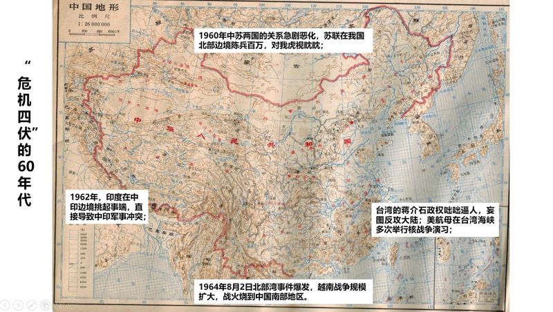 为了解答疑惑,课堂首先回归历史现场。老师通过中国周边战略态势图引导同学们查阅史料:从历史和地缘政治看,古代中原政权的被入侵威胁,多来自西北方向,因此中原政权和经济重心不断向东南迁移。到了近代,西方殖民主义海洋霸权兴起,中国遭受了多次侵略战争(第一次、第二次鸦片战争,中法战争,中日甲午战争,八国联军入侵战争,争夺中国东北的日俄战争,抗日战争)几乎都是来自东部沿海,而新中国的基础工业和大城市,几乎都分布在东南沿海。上世纪60年代中期,新中国同时面临四周严峻军事压力,在东南方台海局势日益紧张、在南面美国入侵越南战争规模扩大到中国南部边境地区、在西南面有中印军事冲突、在北部边境有苏联陈兵百万。彼时,我国约60%的主要民用机械工业和52%的国防工业都集中在东部沿海大城市,极易在战争初期遭受毁灭性打击。通过图片演示后,参与讨论的同学们感悟到,此时的中国就像一个巨人,把心脏和大脑都暴露在对手拳脚之下。